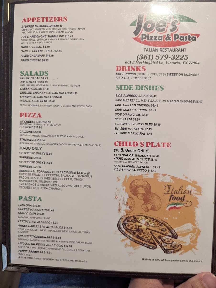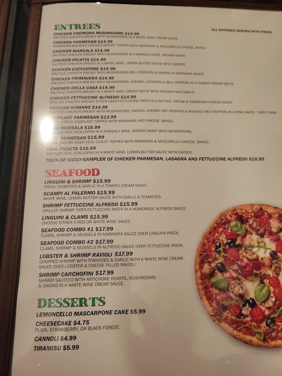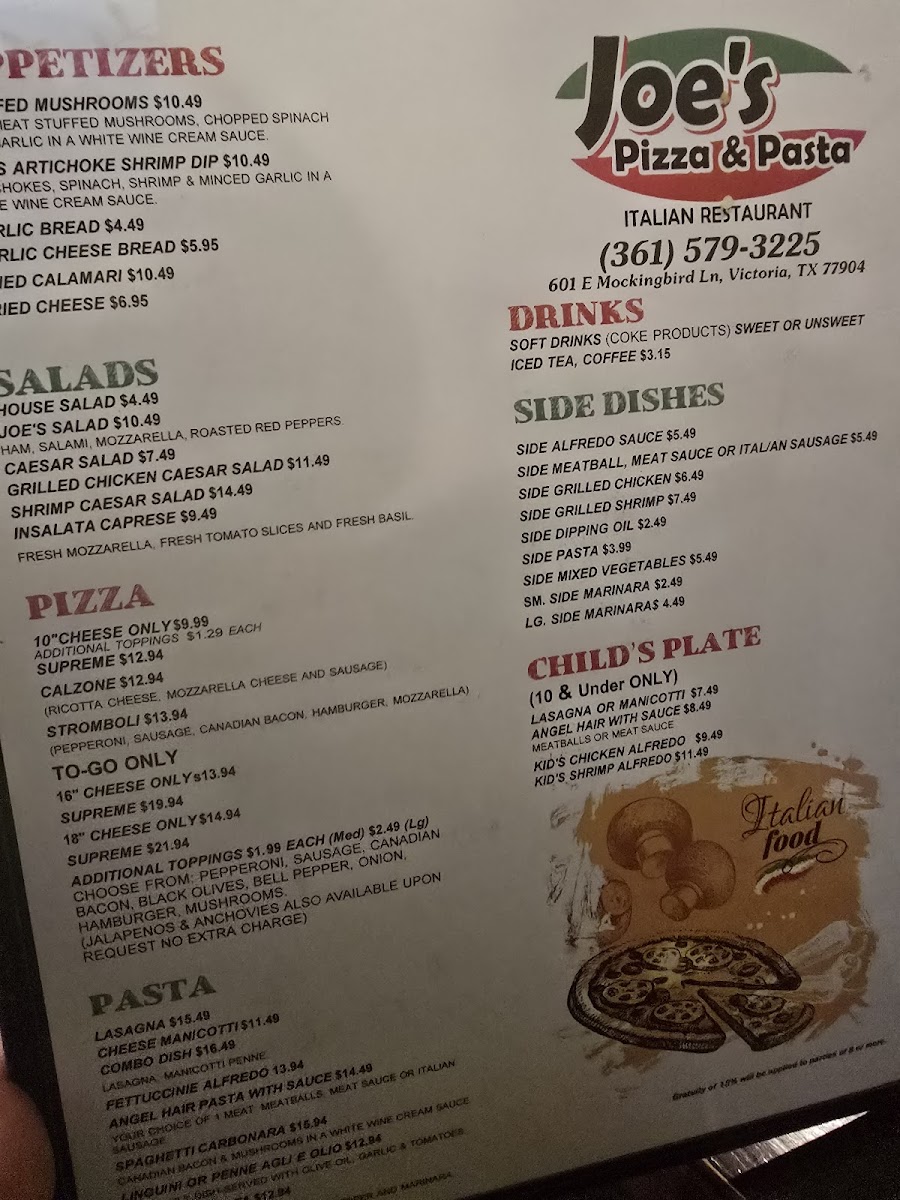 The food here complements the welcoming, laid-back atmosphere of the bistro. Many enjoy the rich flavors of dishes like Chicken Fettuccine Alfredo or the vibrant House Salad paired with freshly baked dinner rolls. The pizza offerings range from straightforward cheese options to more loaded choices like the Supreme Pizza, making it easy to share and enjoy with friends or family. Light appetizers such as Joe’s Artichoke Shrimp Dip or Crabmeat Stuffed Mushrooms set a pleasant tone before the main meal.